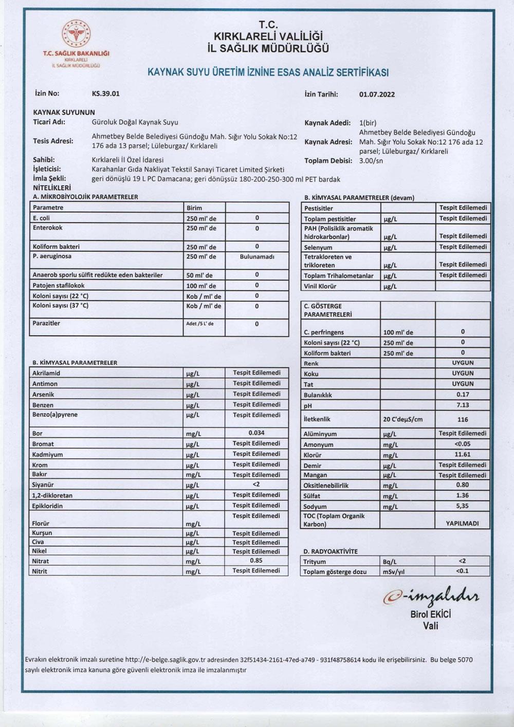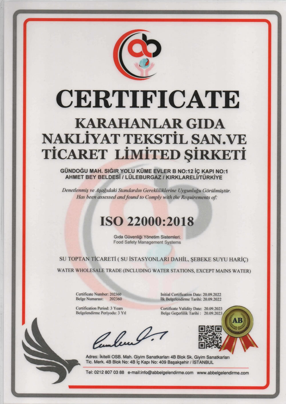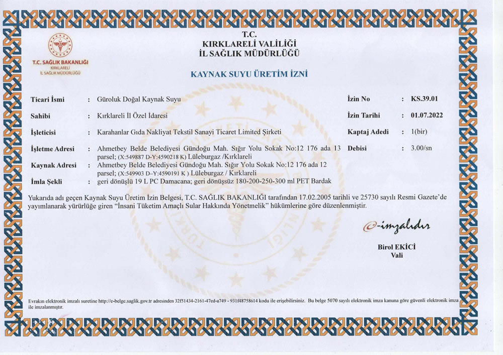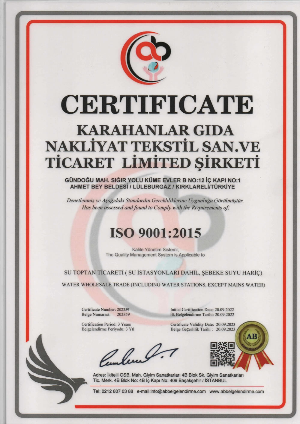 Bu belgeler satışı yaptığımız Güroluk Su’ya ait kalite belgeleridir. Markalarımızdan Güroluk Su, yüksek standartlara sahiptir ve bunu uluslararası sertifikasyonlarla bu standartları belgelemektedir.